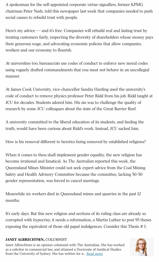 The extreme case, so far, is Janet Albrechtsen in the Oz (no link), using the term to describe veteran corporate gadfly Stephen Mayne, also notable as the founder of Crikey and previously an advisor to Jeff Kennett. Mayne certainly makes trouble for the cosy network of the Australian corporate elite, but describing shareholder activism* as “woke” stretches the term beyond any possible limit. In the current case, he is campaigning for more independent directors, while Albrechtsen (in a very confused piece) plays the gender card against him,