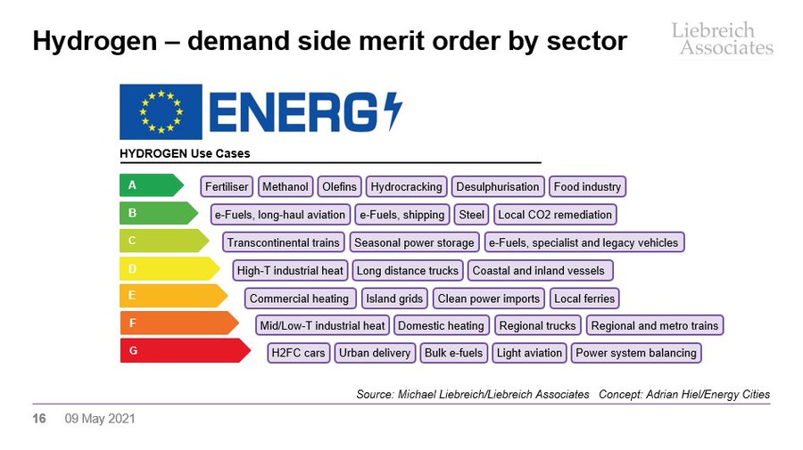 Useful ranking of uses for hydrogen from Michael Liebreich, based on the European labelling of energy efficiency for domestic appliances: